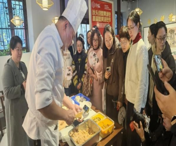 随后,女教师们走进“伙头烧蟹黄汤包”店,聆听了店主戴晓丽与丈夫“蟹黄汤包制作技艺”核心传承人孙卫成的创业故事。从10平方米的小店到标准化中心工厂,夫妇二人始终以非遗技艺为根基,深耕镇江本土美食文化,让每一只汤包都承载城市的历史底蕴与温度。戴晓丽表示,非遗传承不仅在于技艺延续,更在于文化内涵的传播。她愿以美食为媒,让更多人了解非遗、爱上传统,让蟹黄汤包成为连接古今、传递乡愁的文化符号。